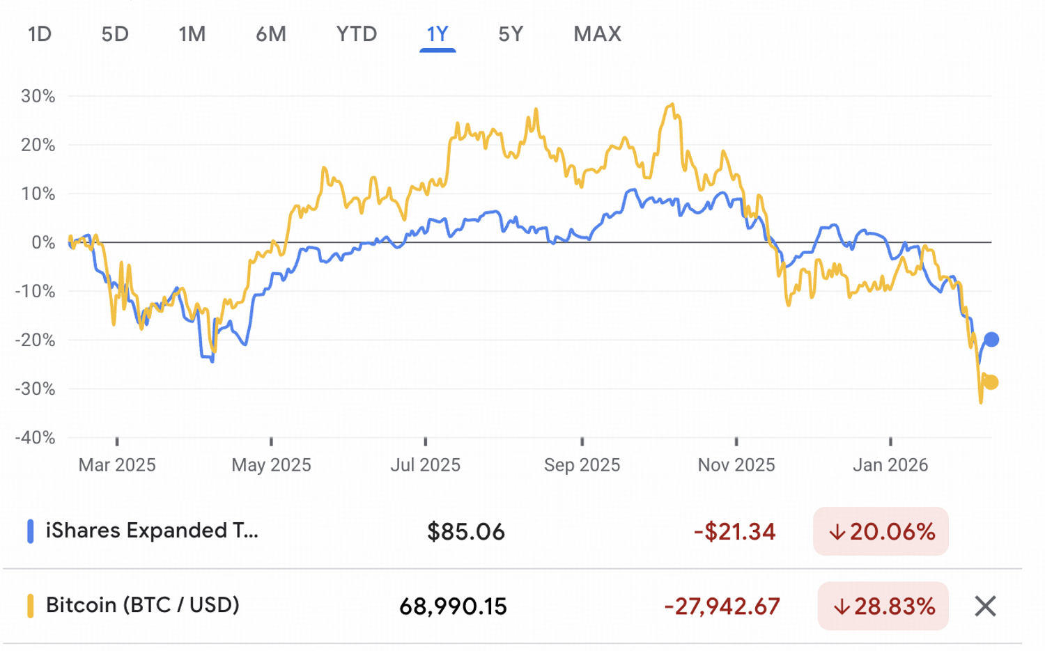 The chart highlights a clear similarity between Bitcoin and the IGV software ETF over the past year, including declining at the same time into early 2026.