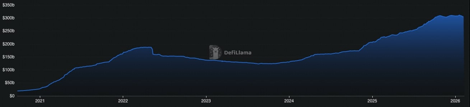Despite Bitcoin’s roughly 40% drawdown in February 2026 from its late-2025 peak, total stablecoin supply has remained broadly stable, with only minor fluctuations during the sell-off.