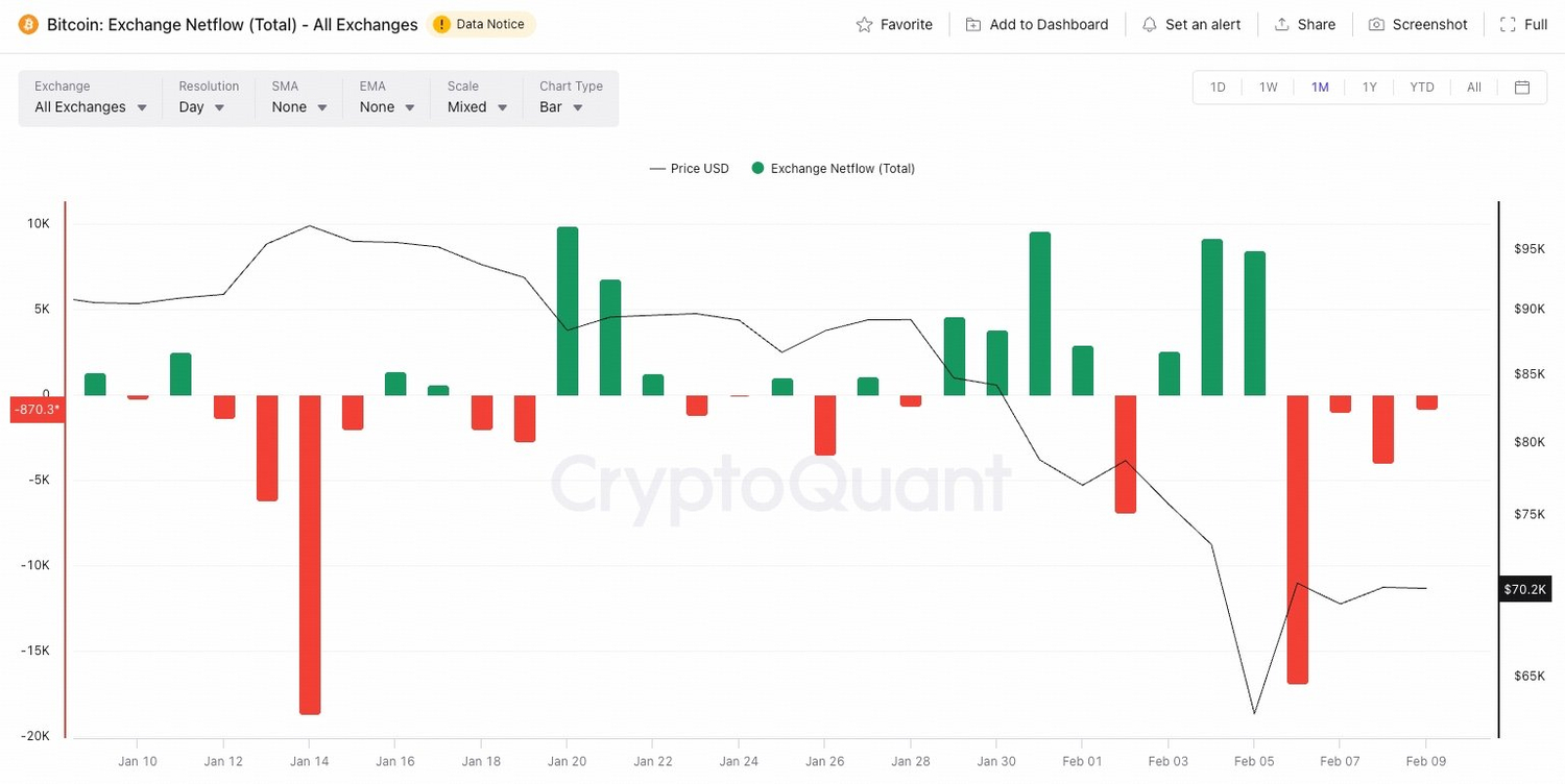 During the sharp price decline on February 6, Bitcoin exchange netflows recorded significant outflows, showing that some investors actively accumulated BTC at lower levels and moved coins to self-custody. However, these outflows diminished rapidly on February 7-8, indicating that the initial accumulation momentum was short-lived and buying interest quickly cooled.