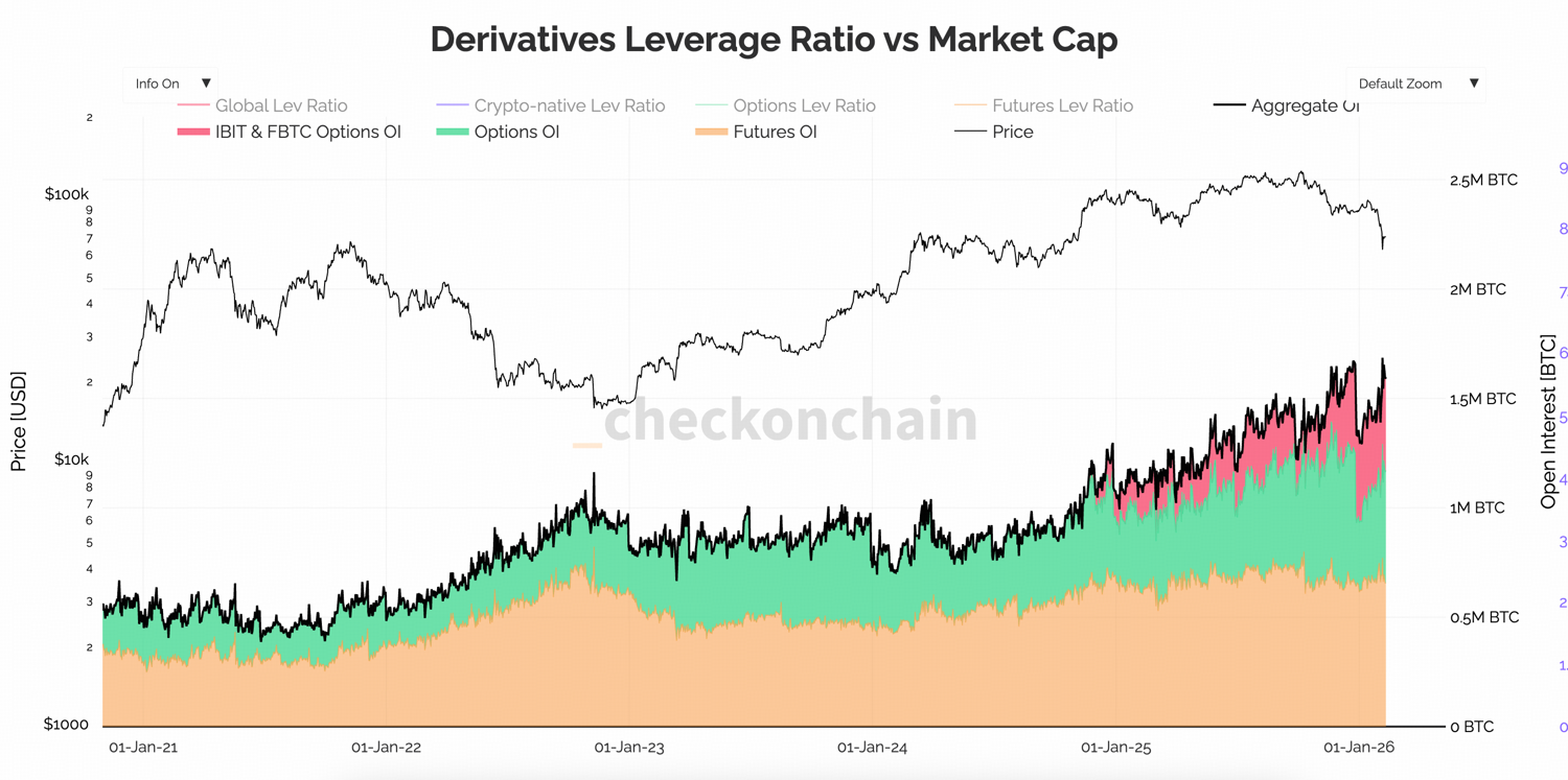 This cycle has also expanded the derivatives complex through ETF-linked products such as IBIT-related instruments. Even after the recent liquidation wave, aggregate leverage remains elevated compared to earlier stages of the cycle.