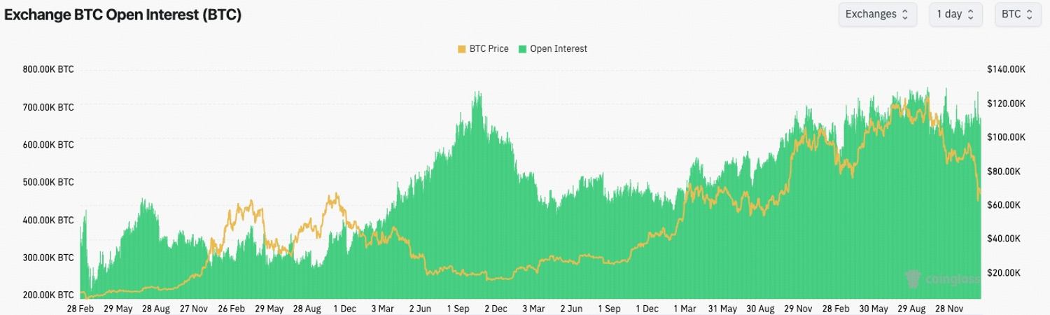 The distinction is critical. BTC-term OI removes price distortion and captures changes in actual contract size. If BTC-term OI remains high, it means leverage remains embedded in the system, even if USD notionals appear lower.
