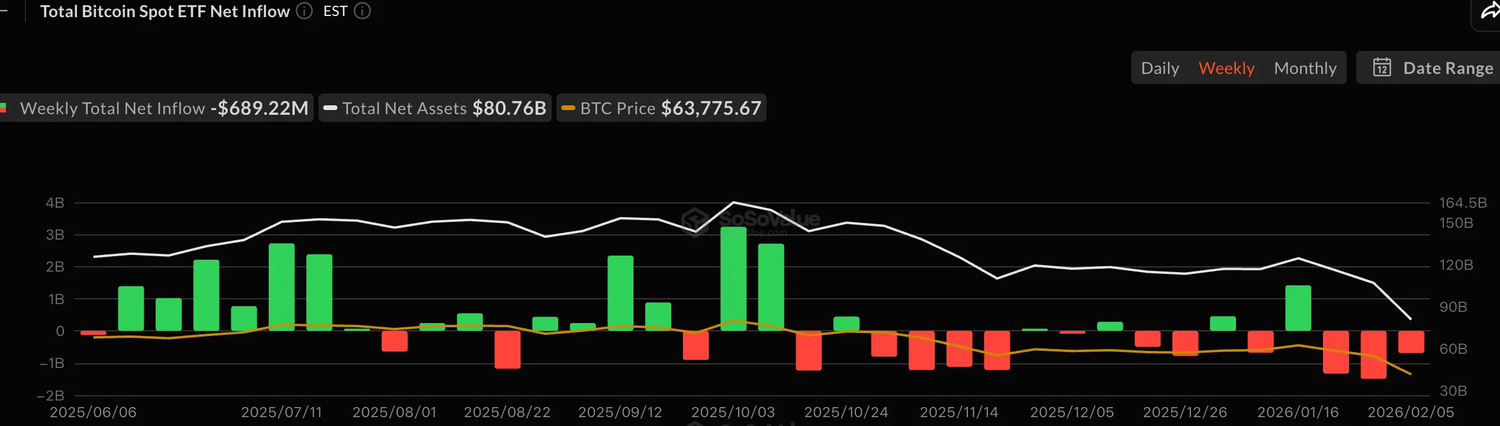 Complementing the on-chain picture, Bitcoin Spot ETF flows revealed limited institutional participation. Weekly net inflows turned substantially negative around the decline (reaching -$689M in the recent week), reflecting significant net outflows and weak institutional buying support. Together, these signals suggest overall subdued confidence and limited accumulation at current price levels.