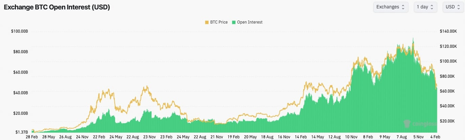 At first glance, recent volatility appears to have triggered meaningful deleveraging. BTC futures open interest measured in USD terms declined sharply during the selloff, suggesting leverage was reduced.