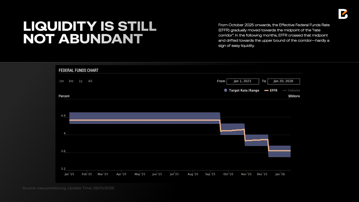 Indeed, between September and December 2025, amid “concerns about a weakening labour market”, the Federal Reserve delivered three “defensive” rate cuts and, in December, announced the end of quantitative tightening. But this did not produce the liquidity flood investors had hoped for. From October 2025 onwards, the Effective Federal Funds Rate (EFFR) gradually moved towards the midpoint of the “rate corridor”. In the following months, EFFR crossed that midpoint and drifted towards the upper bound of the corridor—hardly a sign of easy liquidity.