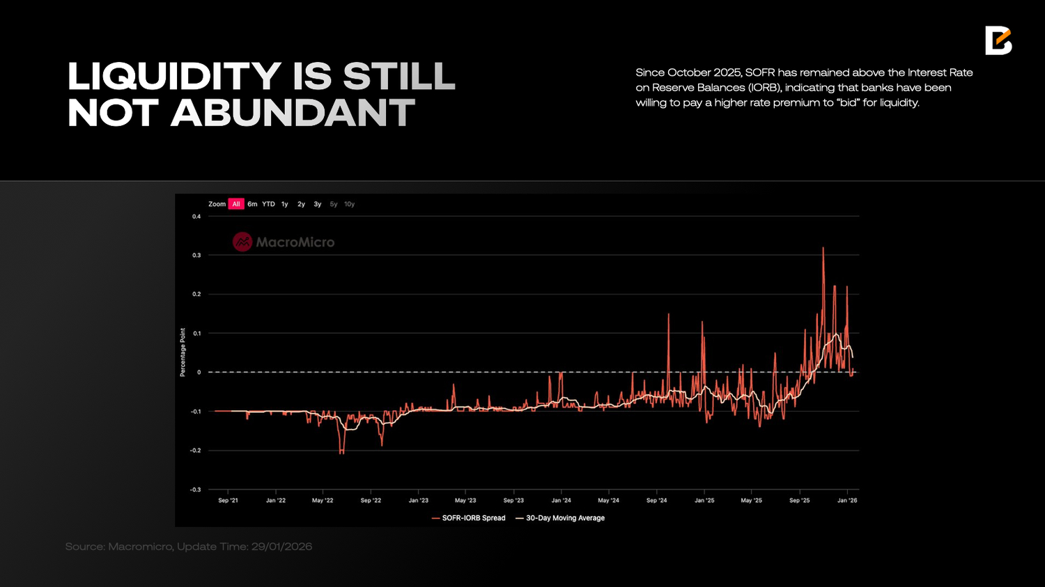 The SOFR–IORB spread further highlights the degree of stress. If EFFR primarily reflects cash-market conditions, SOFR, secured funding collateralised by US Treasury securities, captures a broader liquidity shortage. Since October 2025, SOFR has remained above the Interest Rate on Reserve Balances (IORB), indicating that banks have been willing to pay a higher rate premium to “bid” for liquidity.
