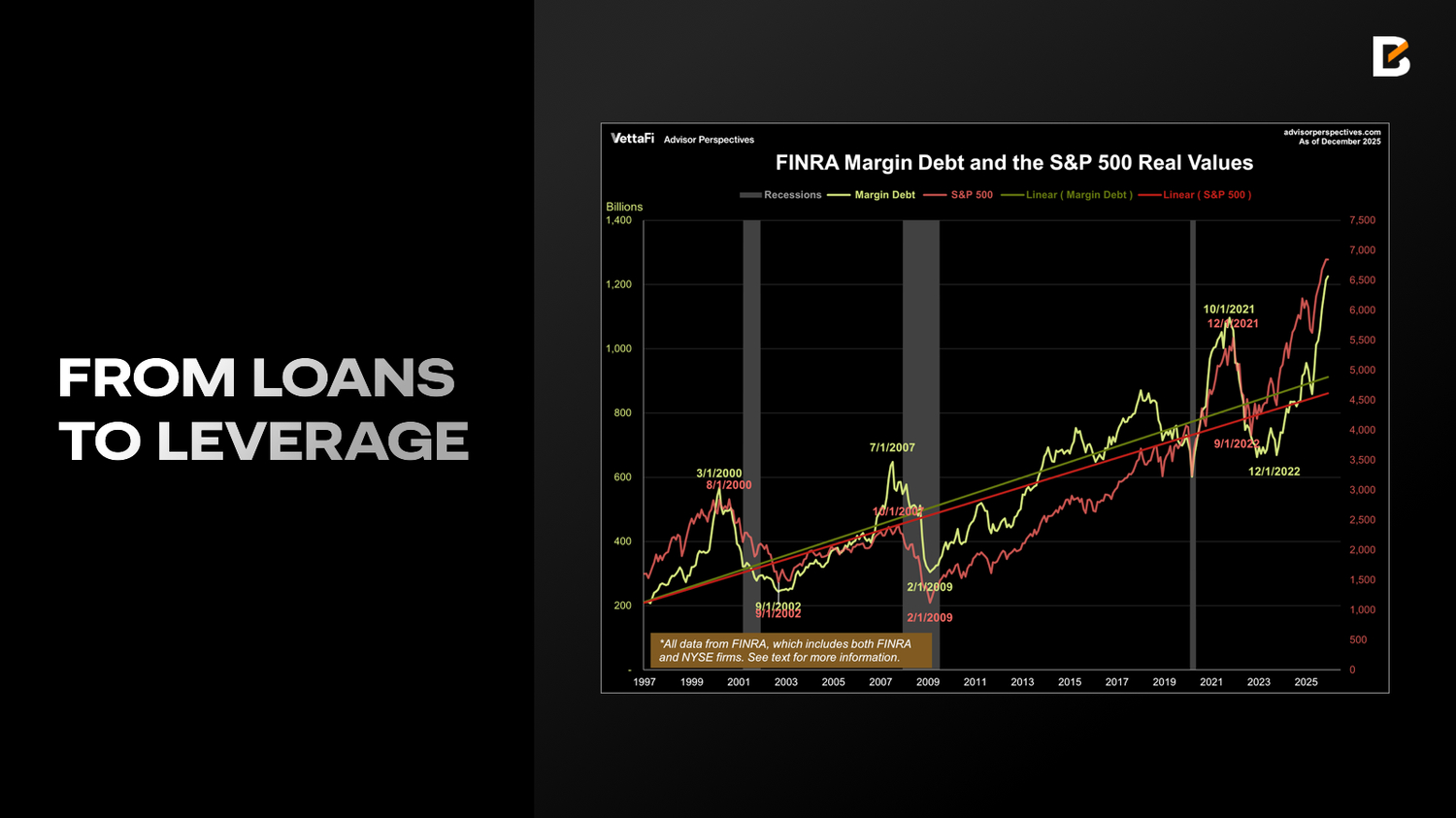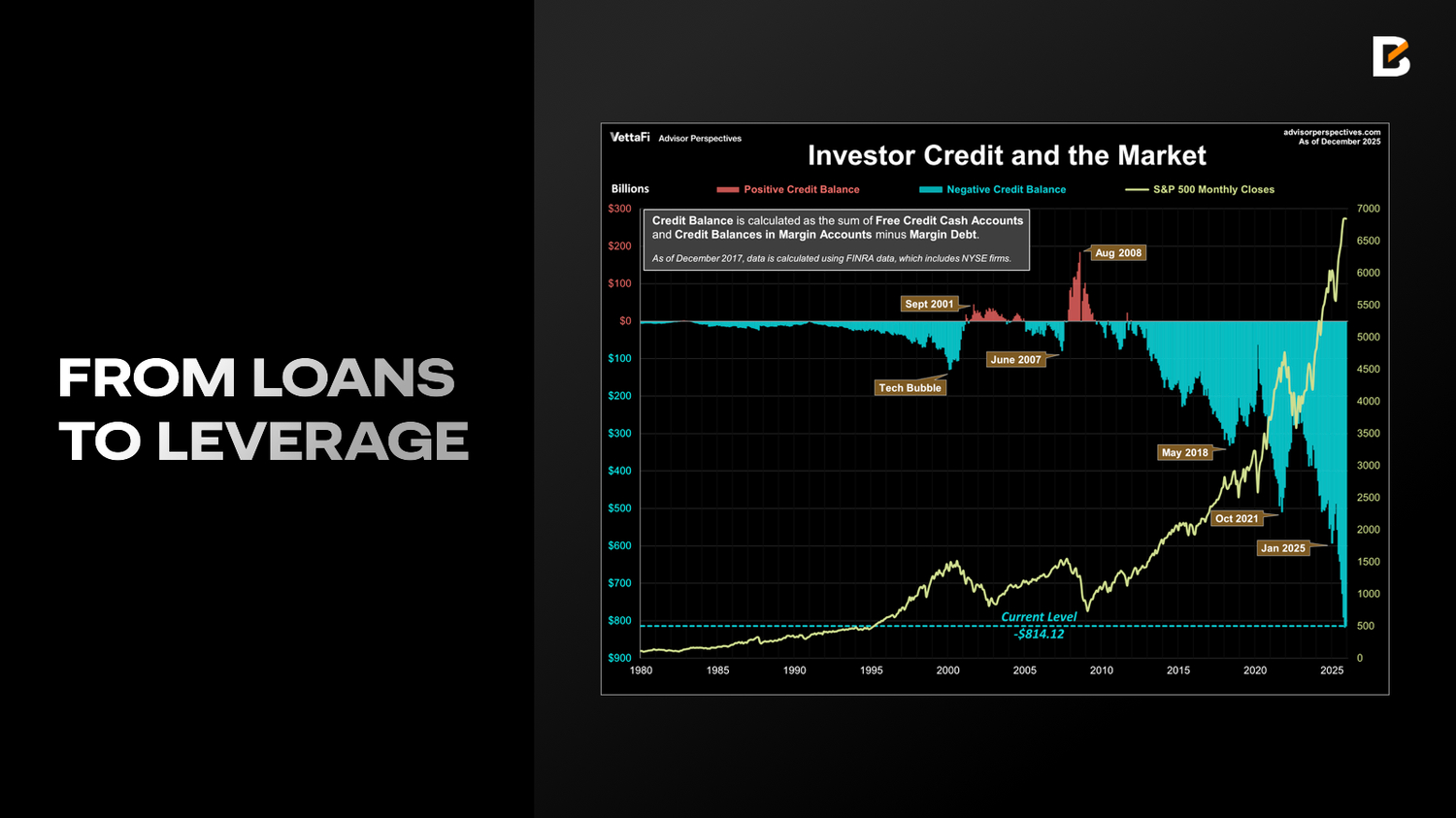 A higher T-bill share has another consequence: liquidity dynamics become less stable. Since a large portion of the liquidity supporting equities is channelled via repo, a greater reliance on T-bills implies more frequent rollovers and a shorter average liquidity “life”. With overall leverage and margin debt already pushing beyond historical peaks, more frequent and more violent liquidity swings weaken the market’s shock-absorption capacity—setting the stage for potential cascading liquidations and large price moves.