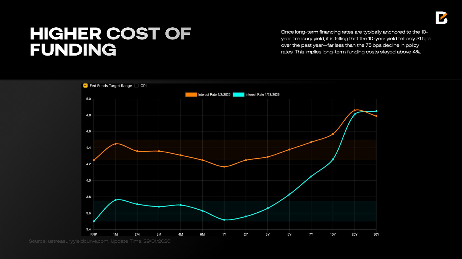 One cost of poorer-quality USD liquidity is that USD-based long-term funding costs remain elevated. This is intuitive: as USD asset markets become more fragile, US Treasury debt expands sharply (reaching USD 38.5 trillion by December 2025), and US fiscal, monetary and foreign policy turn more uncertain and less predictable, the perceived probability of systemic risk rises over time—prompting long-term Treasury investors to demand greater compensation. Since long-term financing rates are typically anchored to the 10-year Treasury yield, it is telling that the 10-year yield fell only 31 bps over the past year—far less than the 75 bps decline in policy rates. This implies long-term funding costs stayed above 4%.