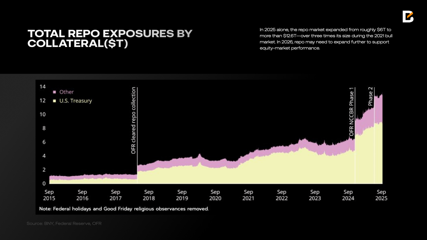 As liquidity requirements grow to push markets higher, the banking system is showing signs of strain, and demand for short-term funding has increased. The fix is straightforward: either reduce margin lending and pull liquidity back, or obtain liquidity support from the Fed and the repo market. For the economy as a whole, the first option is preferable—lower system-wide leverage and strengthen resilience in banks and the financial system—but it would also imply lower valuations and a sharp equity sell-off. Given the midterm-election backdrop, the White House is unlikely to accept that path. As a result, in 2025 alone, the repo market expanded from roughly $6T to more than $12.6T—over three times its size during the 2021 bull market. In 2026, repo may need to expand further to support equity-market performance.