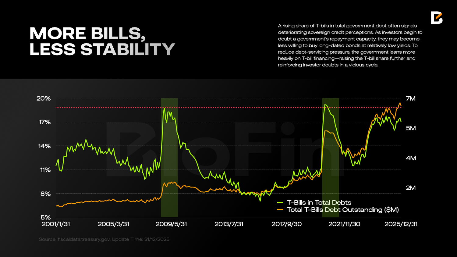 Repo transactions typically use US Treasuries—“high-quality assets”—as collateral. Historically, Treasury notes (T-notes) have been the most important form of collateral. But since mid-2023, that has changed, in part because the issuance and outstanding stock of Treasury bills (T-bills) has increased in an “exponential” fashion. This is not benign: a rising share of T-bills in total government debt often signals deteriorating sovereign credit perceptions. As investors begin to doubt a government’s repayment capacity, they may become less willing to buy long-dated bonds at relatively low yields. To reduce debt-servicing pressure, the government leans more heavily on T-bill financing—raising the T-bill share further and reinforcing investor doubts in a vicious cycle.