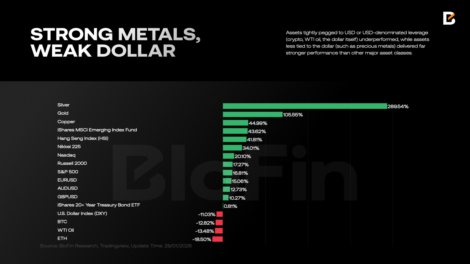 Meanwhile, after decades, “strict diversification” made a comeback in 2025. Unlike the traditional 60/40 approach, liquidity has been spread across a broader set of instruments rather than confined to USD assets. In fact, throughout 2025, investors steadily reduced the share of USD and USD-pegged assets in portfolios. Although persistent net outflows did not visibly hit US equities, incremental liquidity was allocated more heavily to non-US markets. Assets tightly pegged to USD or USD-denominated leverage (crypto, WTI oil, the dollar itself) underperformed, while assets less tied to the dollar (such as precious metals) delivered far stronger performance than other major asset classes.