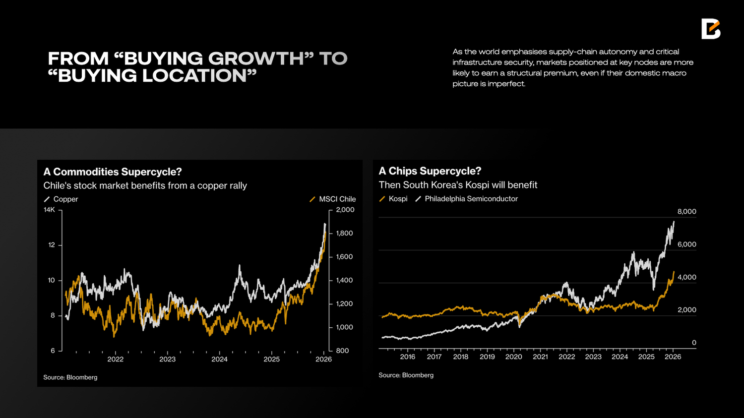 If 2010–2021 equity allocation was largely about “buying growth and falling discount rates”, 2026 is more about “buying location”. “Location” refers to where a market sits on three maps: the resource map, the compute map and the security map. As the world emphasises supply-chain autonomy and critical infrastructure security, markets positioned at key nodes are more likely to earn a structural premium, even if their domestic macro picture is imperfect.